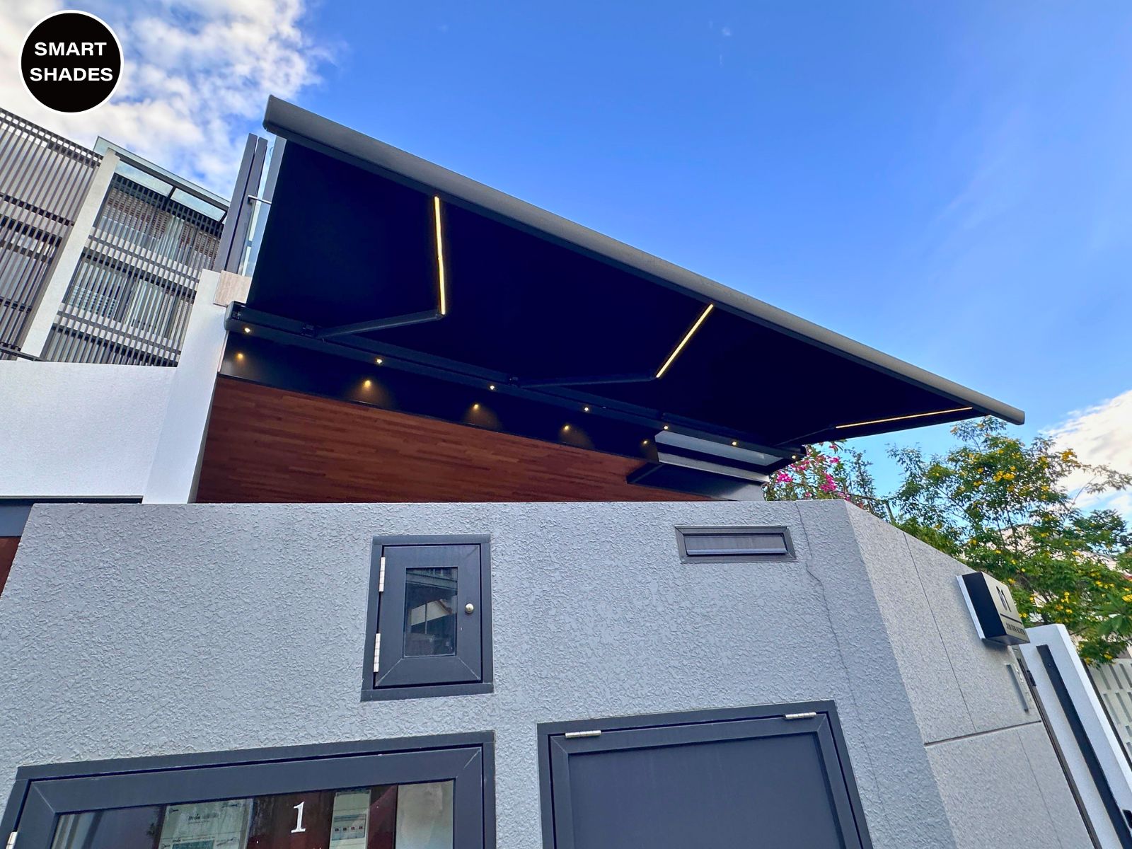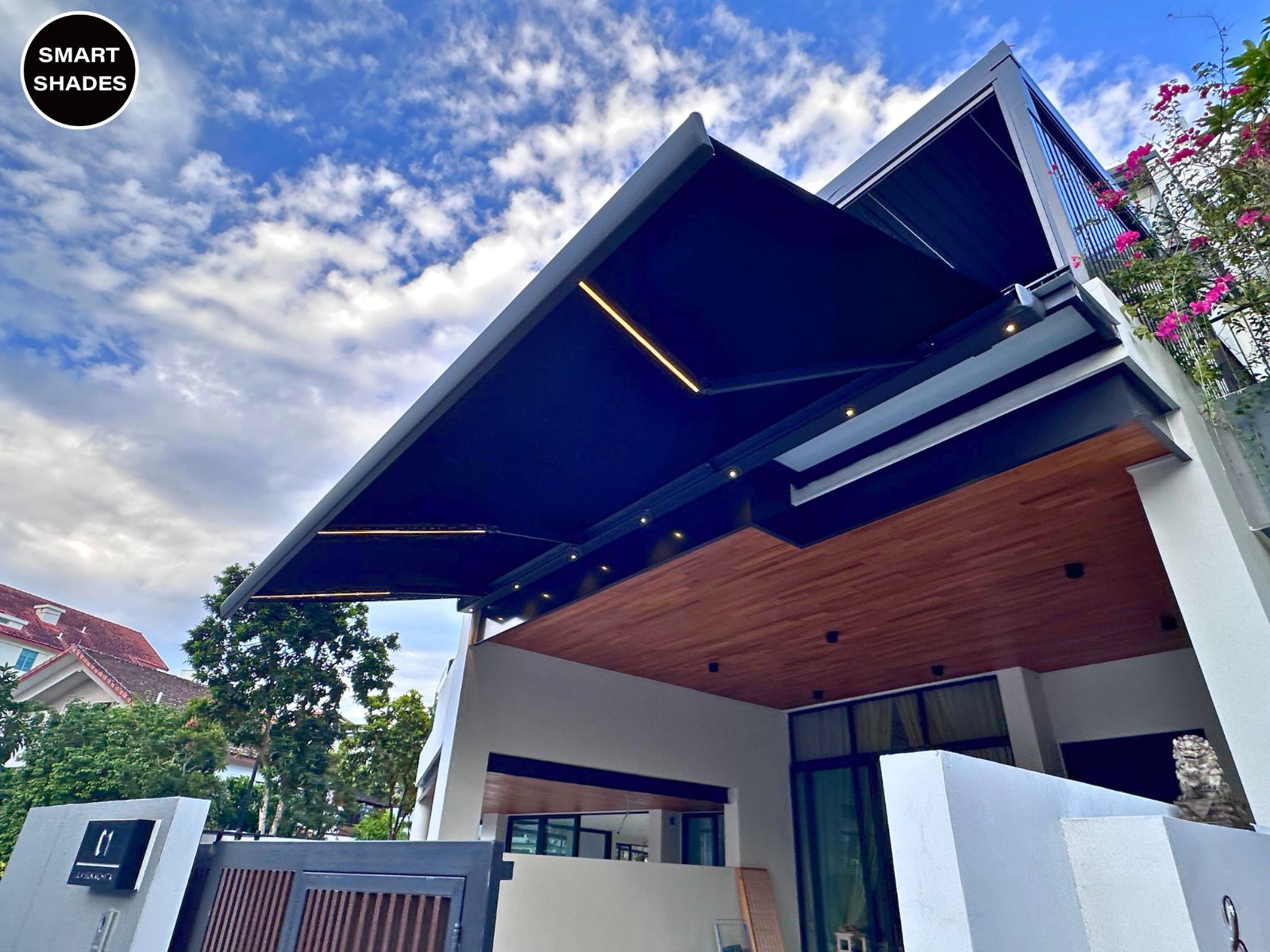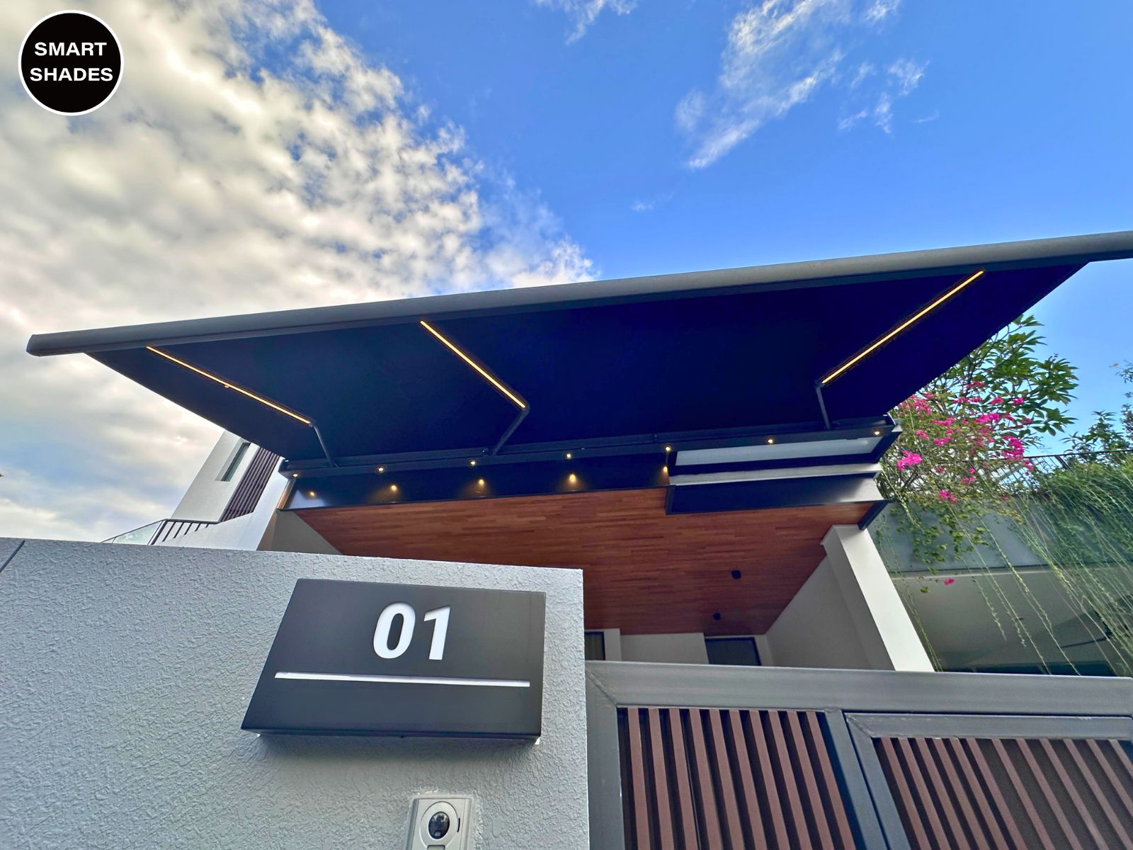 Smart Awning System offers a motorised retractable roof with LED ambient lighting for patios, balconies, and car protection.